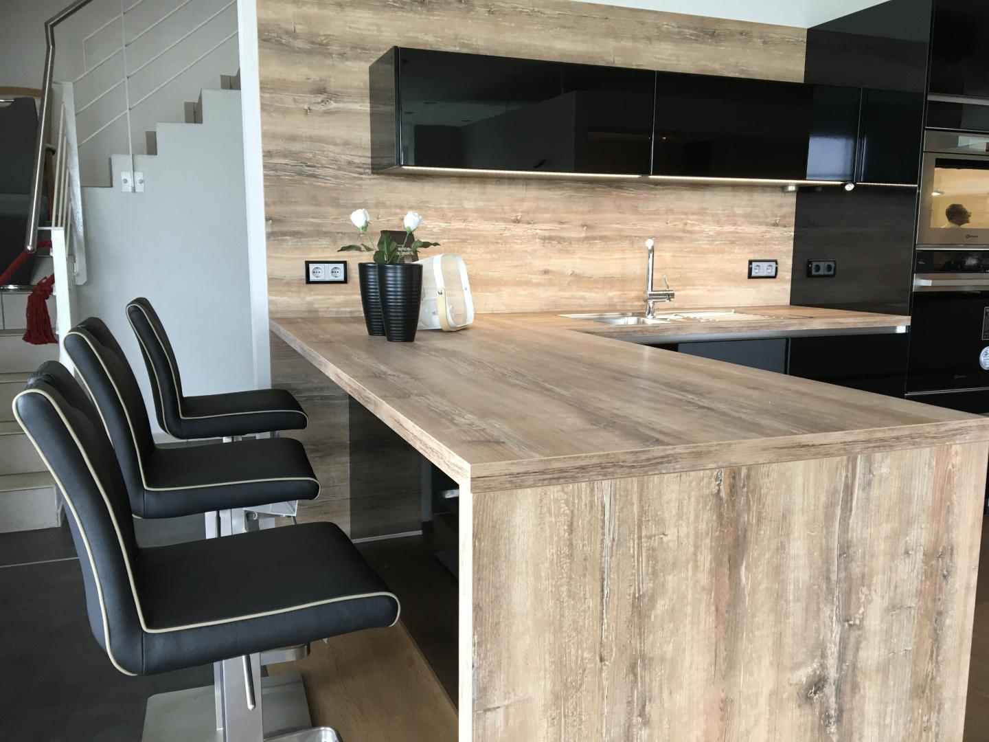 Die moderne Küche verfügt über grifflose Schränke, die ein elegantes Erscheinungsbild ergeben. Ein praktischer Handtuchhalter ist in Reichweite, sowie ein Dampfgarer und Backofen, der sich zusätzlich über eine Handyapp steuern lässt. Die Beleuchtung mit Farbwechsel ermöglicht die Stimmung nach ihren Vorlieben anzupassen. Außerdem bietet die Küche einen stilvollen Bartresen mit drei bequemen Barhockern.